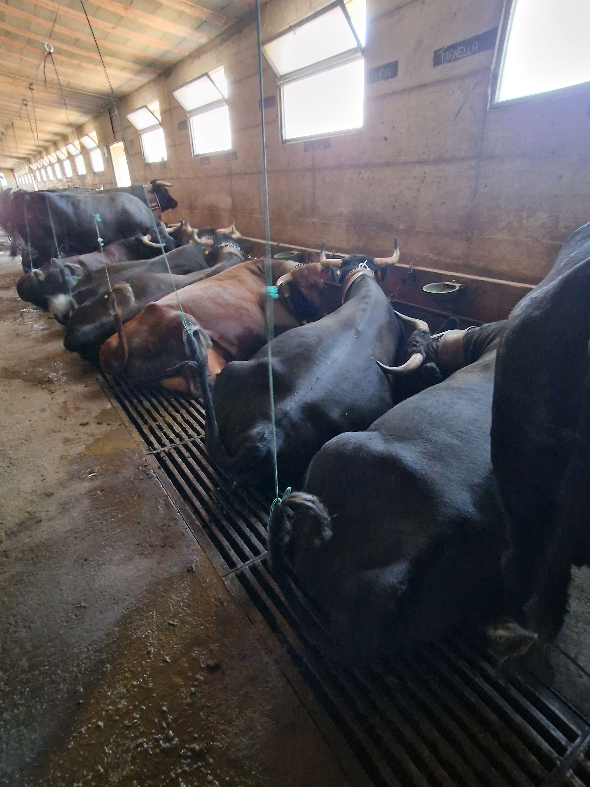 la mungitura avviene 2 volte al giorno, mattina e sera, si perchè la mandria ha bisogno di due scampagnate al pascolo, quindi si parte presto alle 4 del mattino la prima volta e poi alle 16 con ritorno serale. Non entrano subito allo stallo, le mucche si soffermano nelle vicinanze, quasi a contemplare il panorama incantevole e respirare quell'aria fresca, pura, rigenerante. Poi in un istante una del gruppo, di solito la più anziana si avvicina all'entrata e a seguire tutte le altre. Sono rimasto stupito perchè non hanno bisogno di essere accompagnate più di tanto, ognuna sa dove è la sua base con il proprio nome. E' veramente entusiasmante! il team (tutti ragazzi e ragazze giovani) si apprestano a preparare la mungitura. Parte un gruppo che lava e disinfetta le mammelle e a seguire il massaggio per stimolare i vasi lattari. Parte la mungitura, la primissima fuoriuscita viene raccolta in un contenitore per analizzare se il latte è a posto, poi inizia la vera e propria mungitura