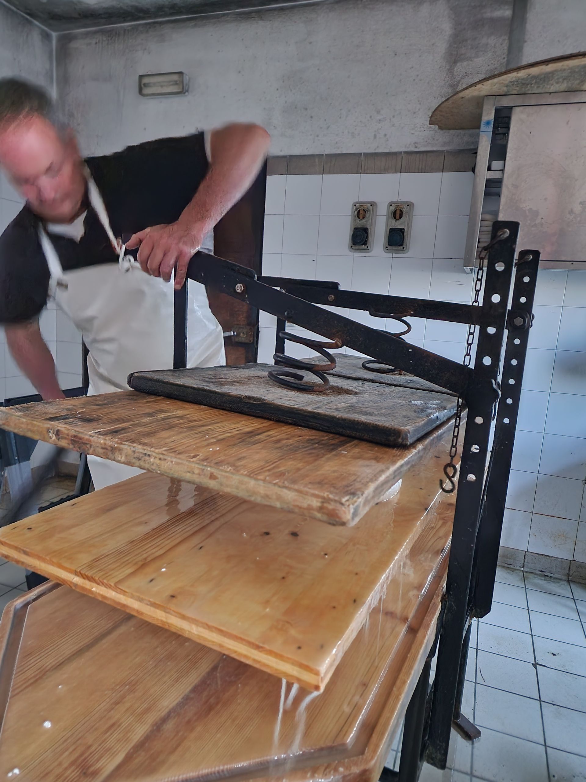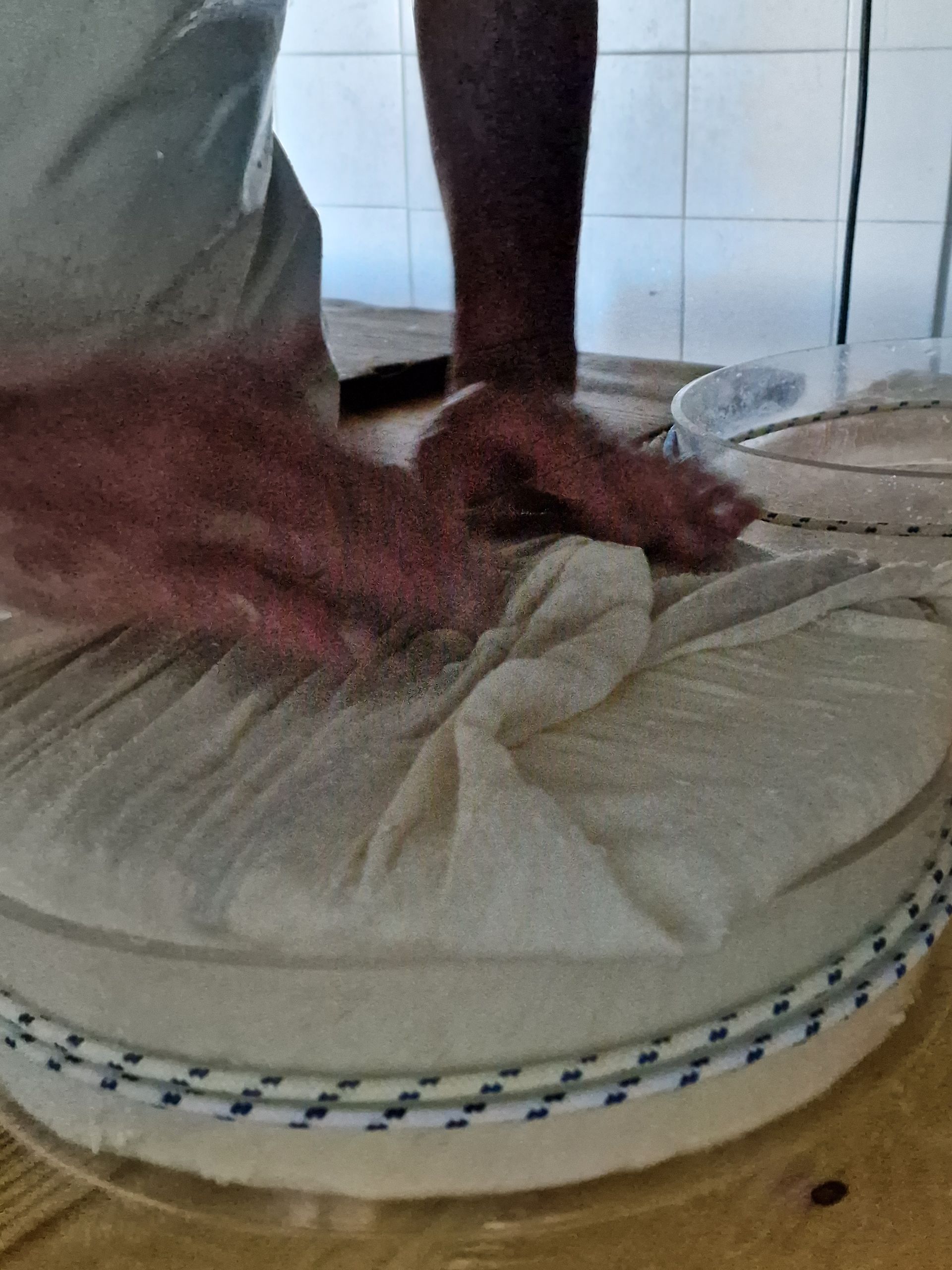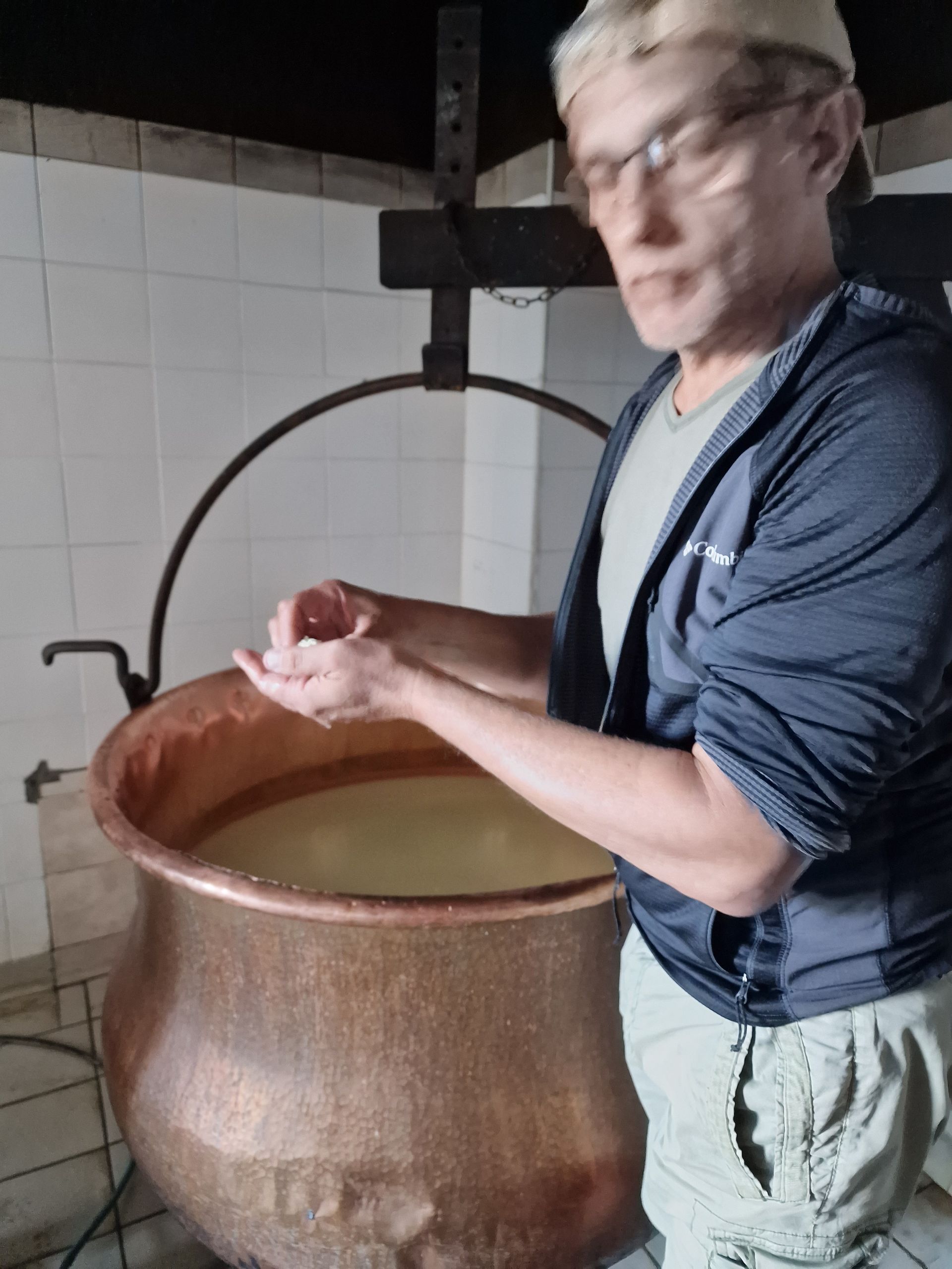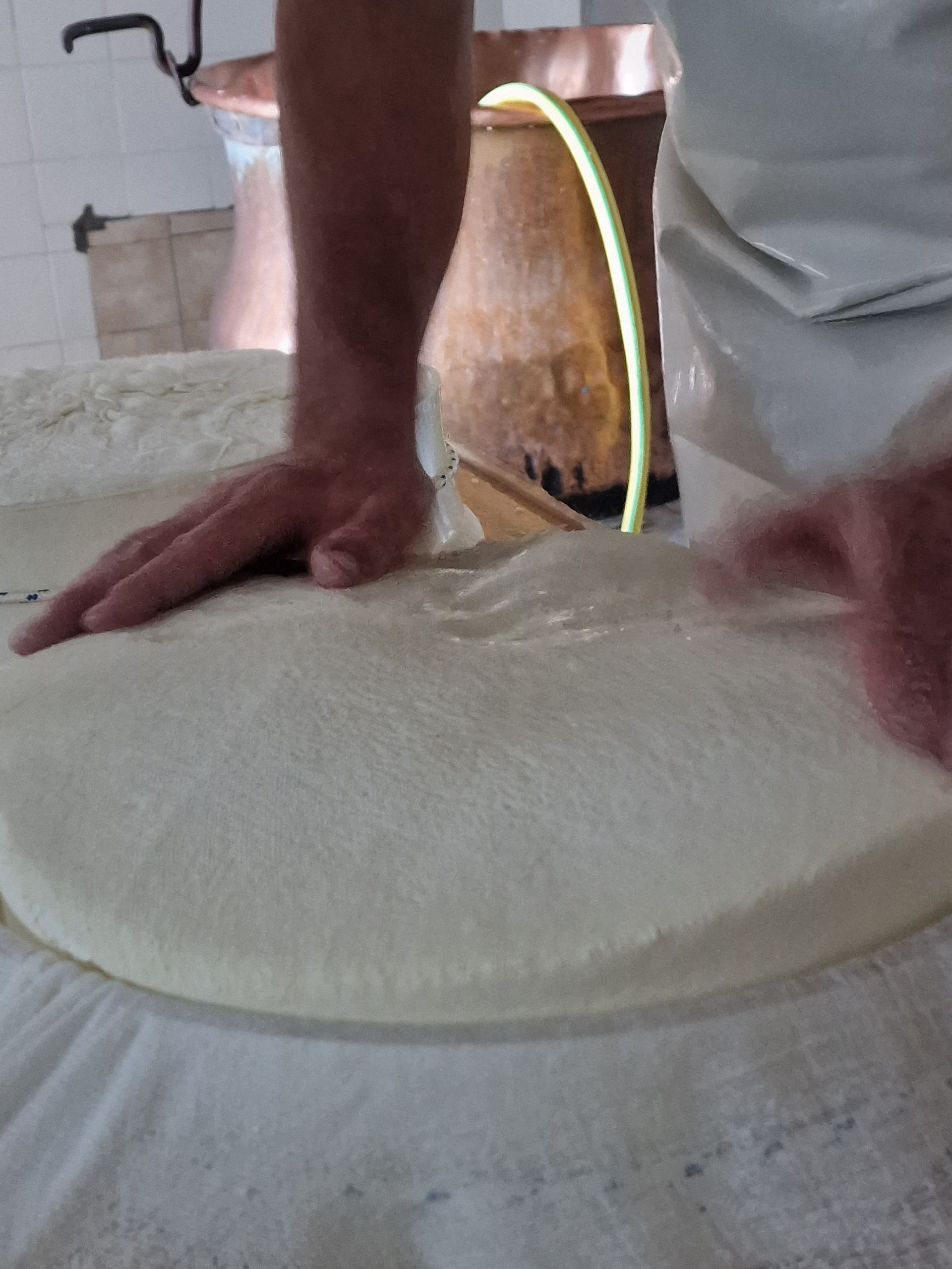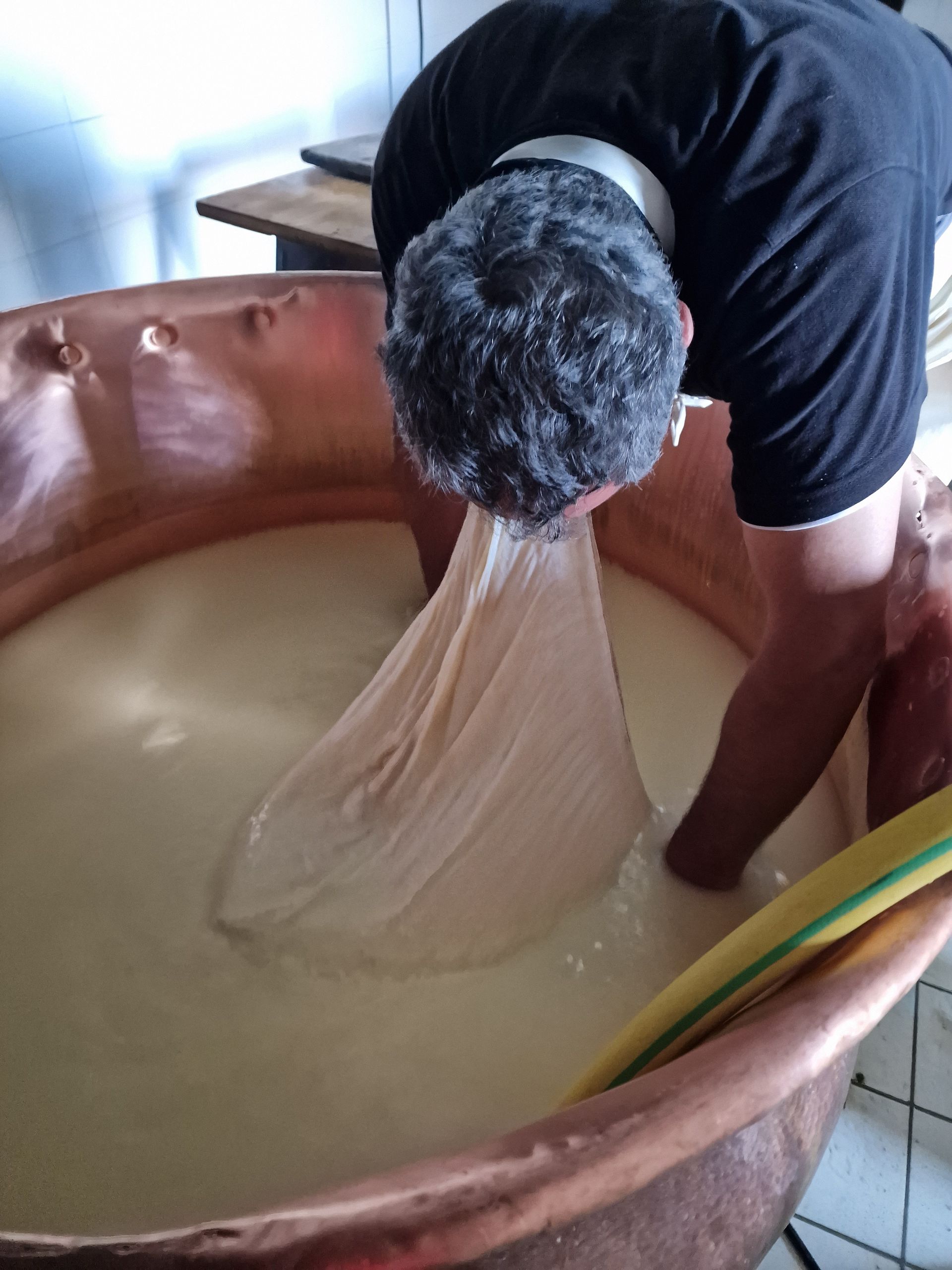 E' tempo di lavorare il latte, non ci si ferma, gesti ancestrali, mani esperte, passaggi ritmati dal saper fare. Il mestiere della malga è impegnativo ma credo che vedere la materia trasformarsi in formaggio, sia stupefacente e appagante. Si prepara la cagliata, appena raggiunta la temperatura si procede alla rottura della stessa con a lira o spino e alla raccolta. Non è facile, ve lo assicuro. Poi la massa tenuta avvolta in teli viene riposta nelle fascere e si procede alla pressatura. Sono letteralmente momenti magici per me, più impegnativi per il casaro però.