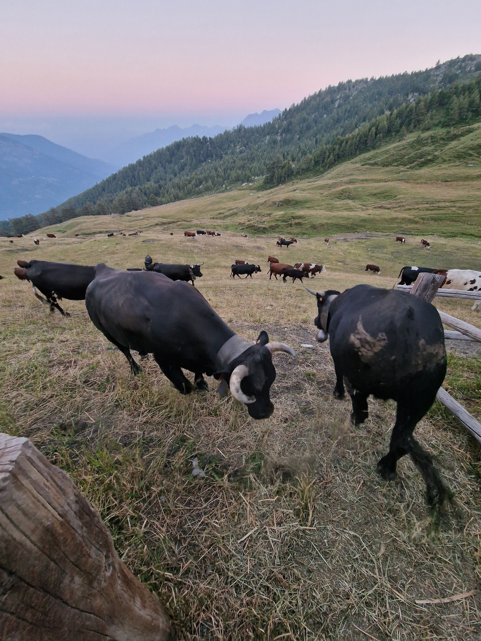 Il calare della sera si avvicina, la mandria lentamente risale il crinale che porta alla malga, tutti si preparano al rientro. Le ragazze approntano i maxi biberonper i vitelli, riempiti del siero risultato dalla lavorazione del formaggio, ci sarà un altro giro di mungitura, bisognerà sistemare il bestiame per la notte, legando in alto con un filo ogni coda della vacca così non si sporcherà nell'espletare i propri bisogni. Le luci si spengono, finalmente e forse arriva anche il momento di riunirsi a tavola per la cena e concedersi l'agoniato riposo senza prima soffermarsi ad ammirare un cielo stellato che non ha fine. L'alba è già alle porte!